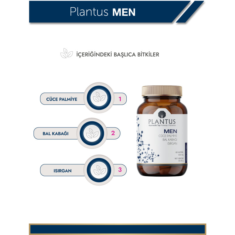 Bitkisel içerikli formülüyle PLANTUS MEN, 18 yaş üzeri erkeklerin genel sağlık ve yaşam kalitesini desteklemeye yardımcı olur. İçeriğinde bulunan cüce palmiye, bal kabağı ve ısırgan özleri, geleneksel bitkisel kullanım geçmişine sahip olup erkek sağlığına yönelik özel olarak seçilmiştir